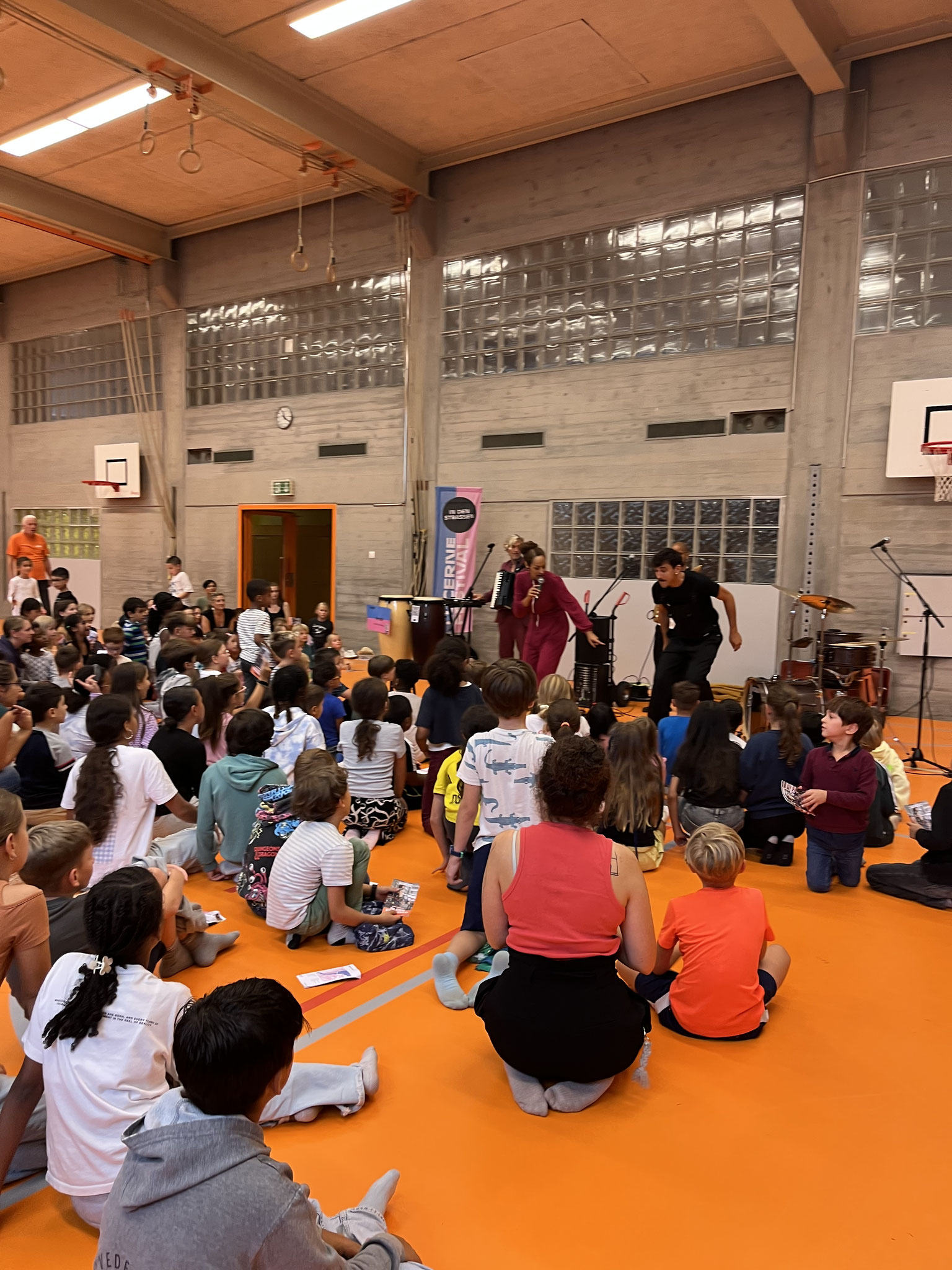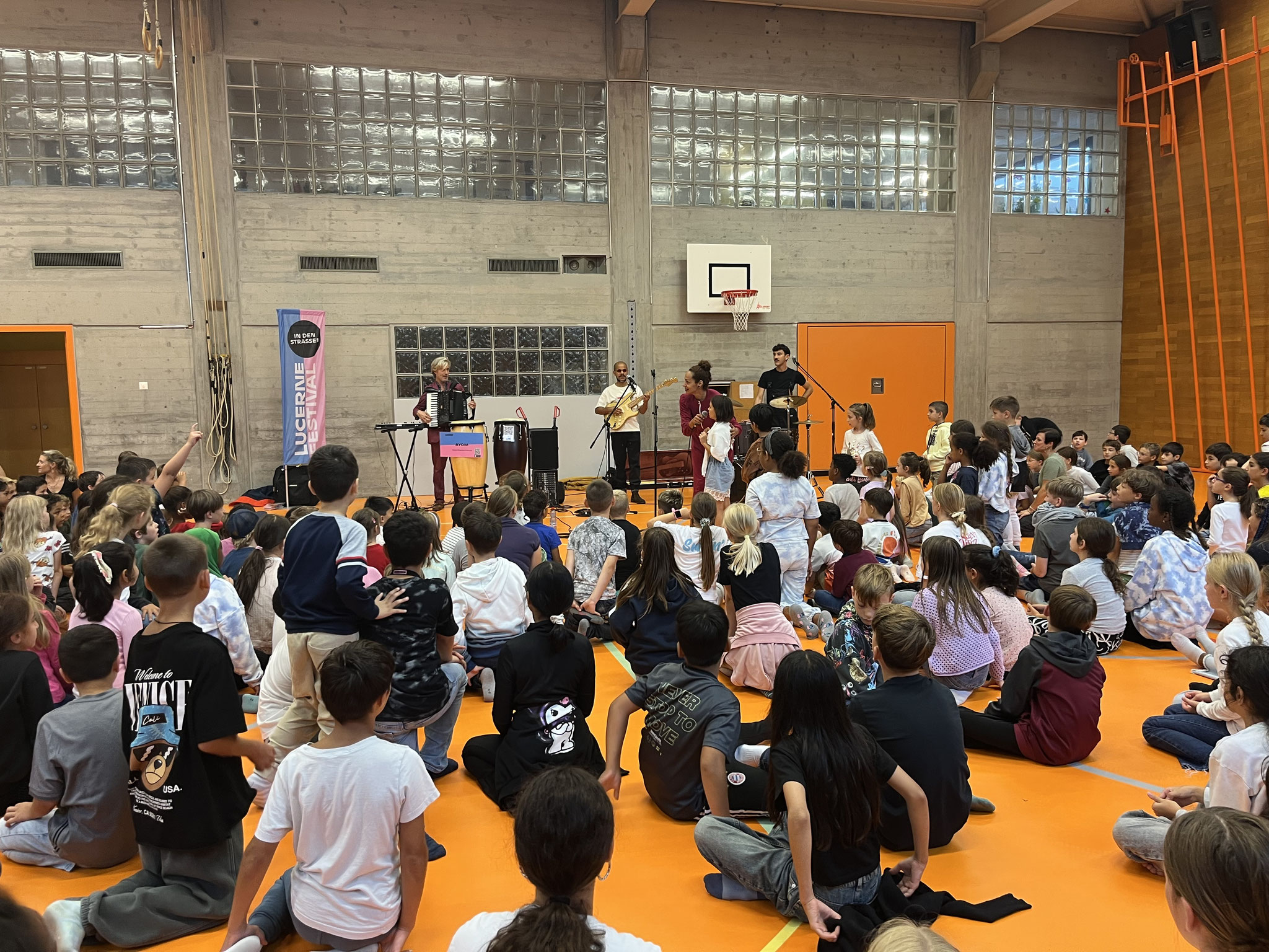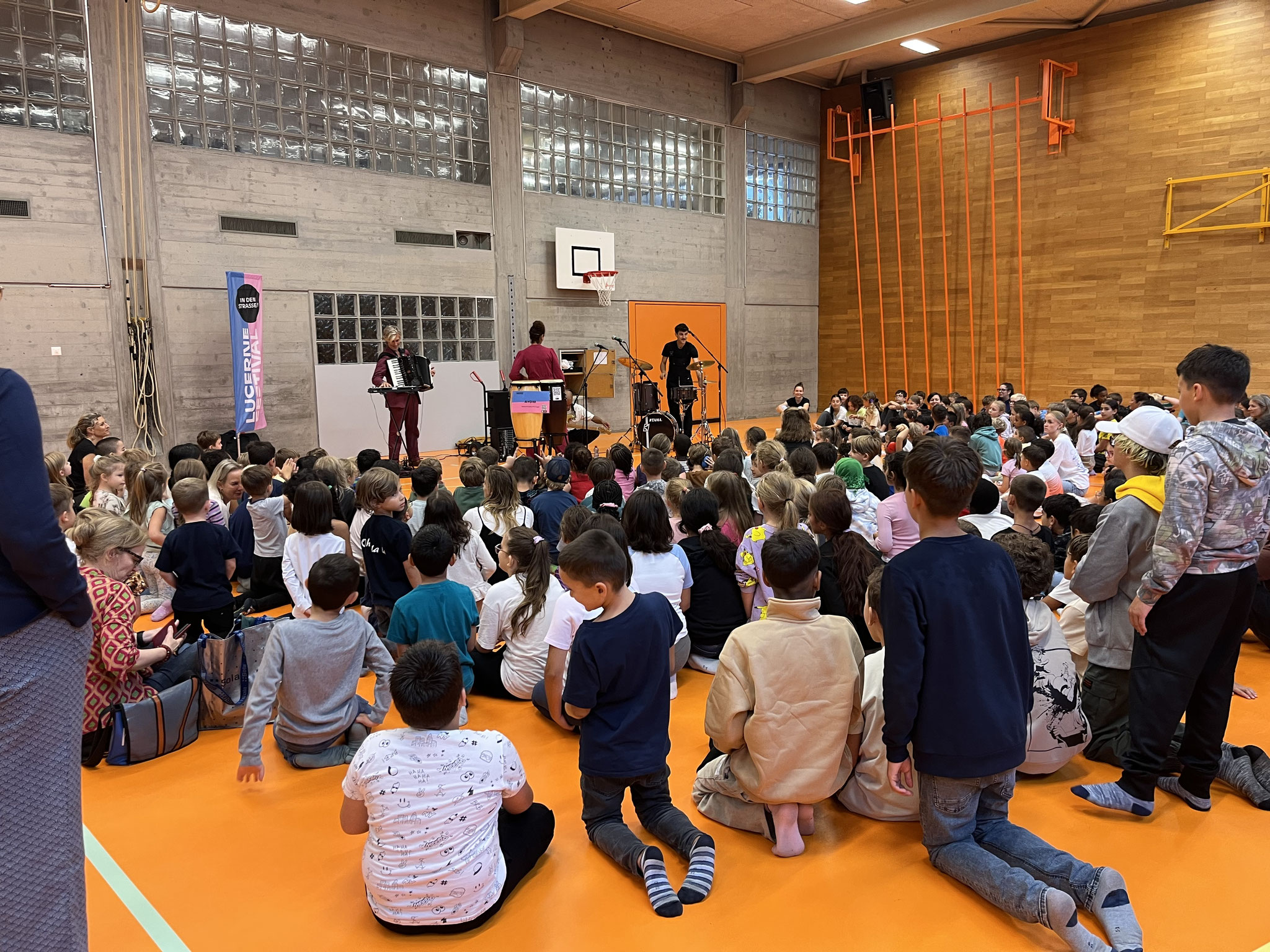 Mittlerweile ist es fast schon eine Tradition, dass die Schule Zentrum in den Genuss eines Konzertes kommen darf. Und so wie jedes Jahr, durften wir im Rahmen vom Lucerne Festival die brasilianische Band AYOM bei uns in Kriens empfangen. Aufgrund des schlechten Wetters wurde die Aufführung in die Turnhalle verschoben, was jedoch nichts an der freudigen Stimmung änderte. Alle kamen durch das eifrige Tanzen und Gumpen ins Schwitzen. Wir bedanken uns ganz fest beim Lucerne Festival und der Band für dieses tolle Erlebnis.