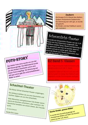 "Aus eins mach zwei, aus zwei mach eins, so geht das Zaubereinmaleins." Dieser und noch viele weitere Zaubersprüche wurden letzte Woche von Kindern der dritten und vierten Klasse fleissig auswendig gelernt. Nicht nur eine Zaubershow wurde für die löwenstarke Woche des Schulhaus Zentrums vorbereitet, sondern viele weitere Ateliers und Darbietungen, welche man über die ganze Woche bestaunen konnte. So gab es beispielsweise starke Tänze und Trommelspiele unserer jüngsten Artisten und Artistinnen. Die dritte und vierte Klasse setzte sich in diversen Ateliers mit verschiedenen Projekten auseinander. Dabei konnten Shows eines Schwarzlichttheaters, eines Mini-Musicals, eine Kunstausstellung und vieles mehr bestaunt werden. Und auch die Schüler und Schülerinnen der fünften und sechsten Klassen begeisterten mit löwenstarken Klängen ihres KiZ-Orchesters.