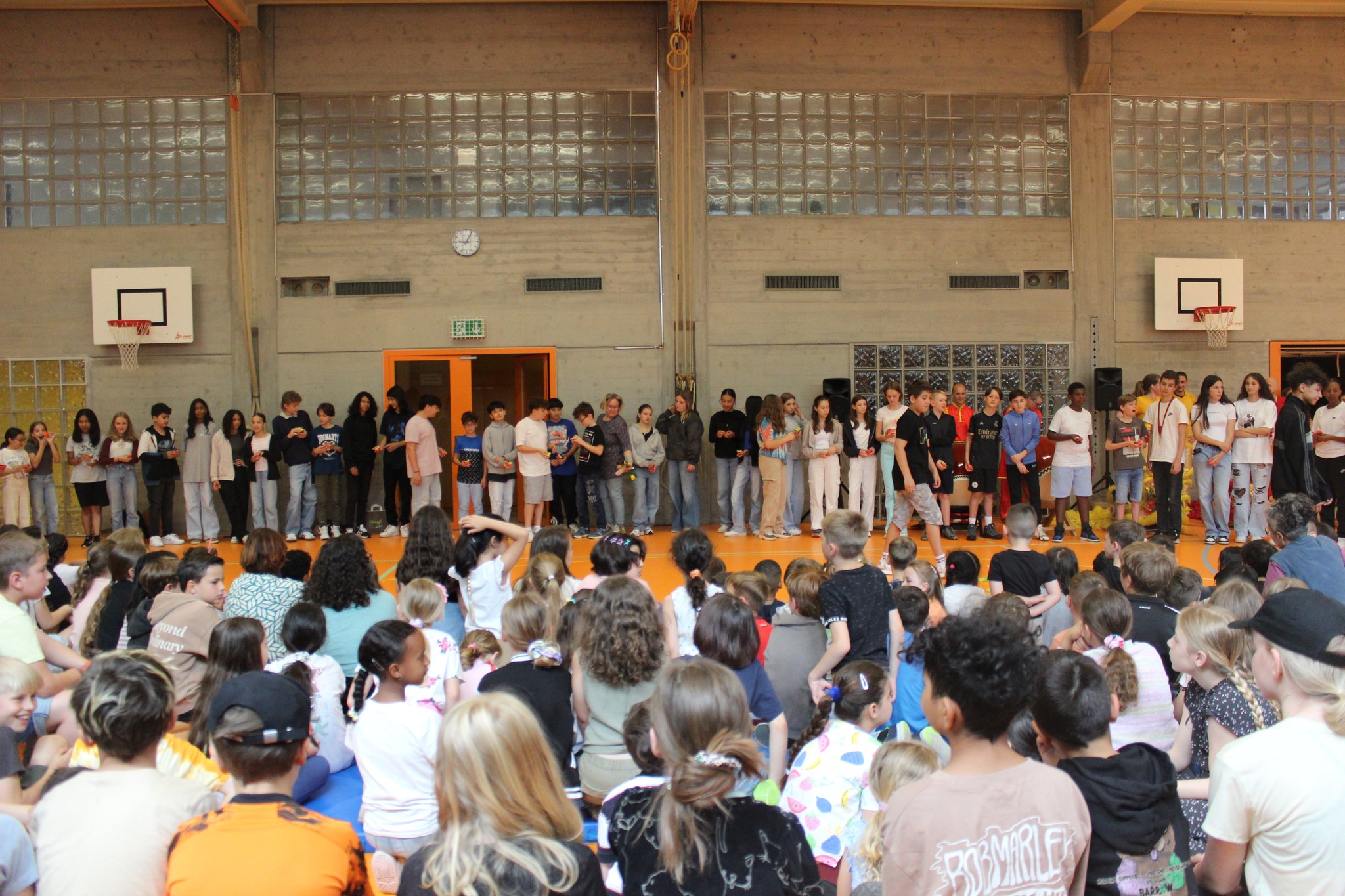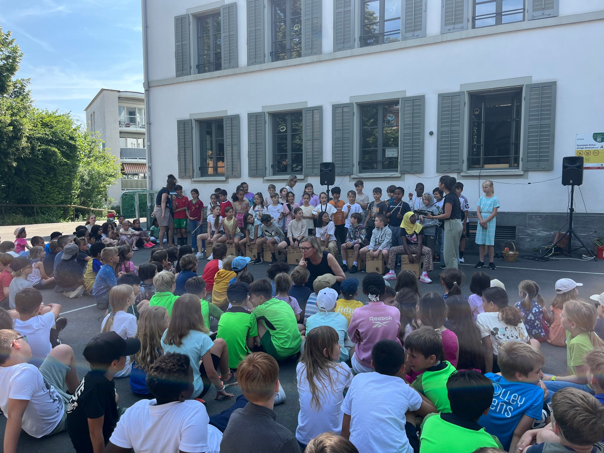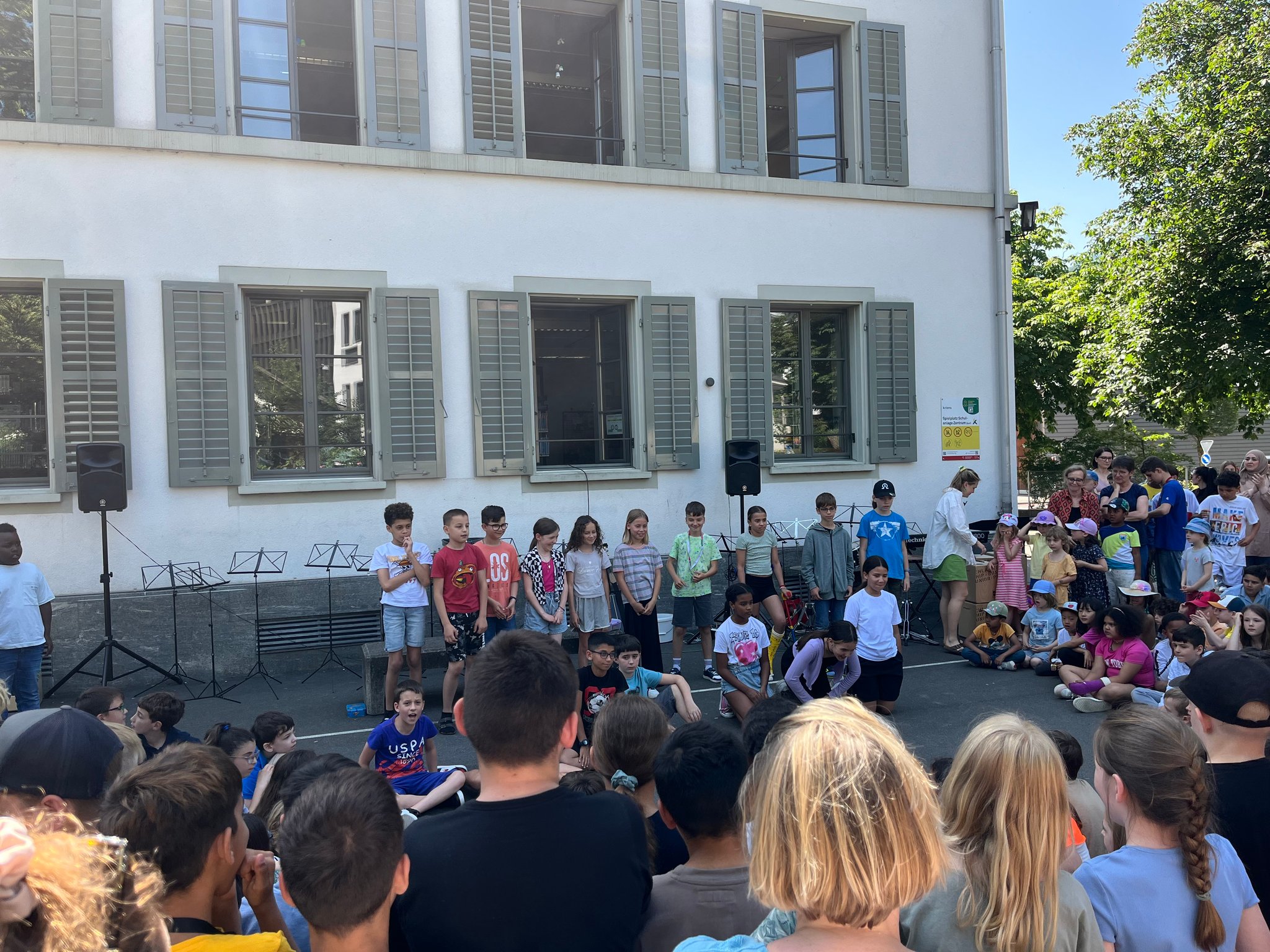 Am 18.06. feierte das Schulhaus Zentrum den Tag der Musik. Dabei gab es Sing-, Tanz- und Bandpräsentationen aus allen Altersklassen. Nicht nur die Schüler und Schülerinnen konnten diverse musikalische Beiträge geniessen, sondern auch viele Eltern kamen vorbei. Auch Fussgänger*innen stoppten, um zu erkunden, woher diese spannenden, musikalischen Klänge herkamen. Nicht nur die Sonne strahlte an diesem Morgen, sondern auch die glücklichen Gesichter von ganz vielen Kindern.