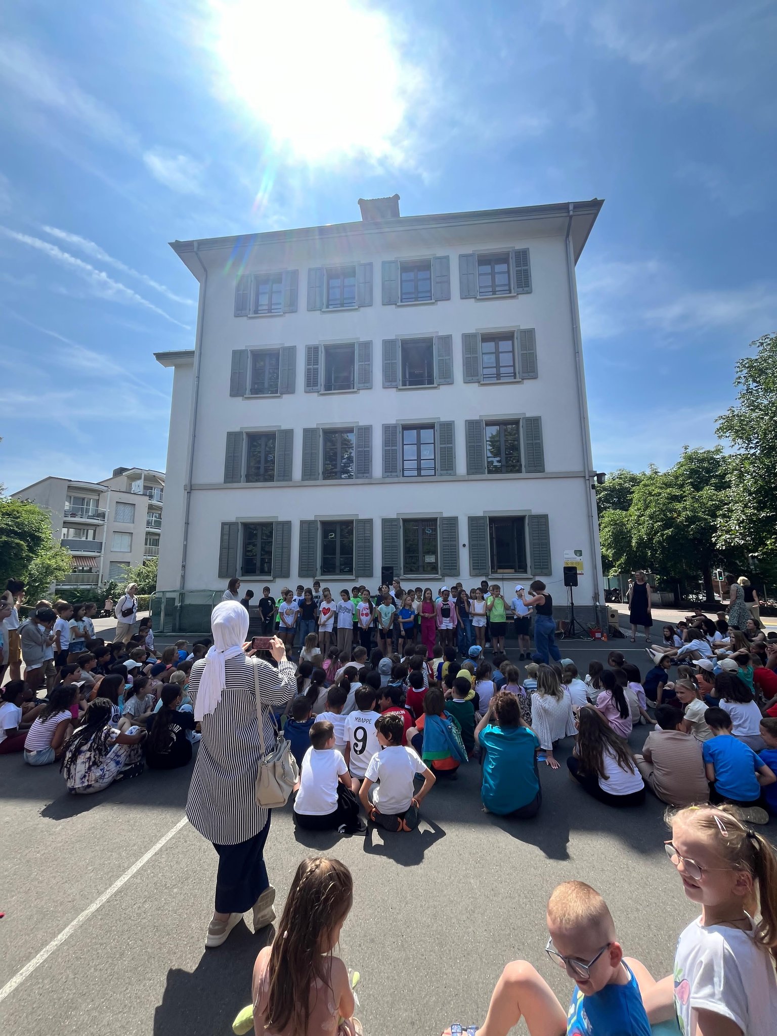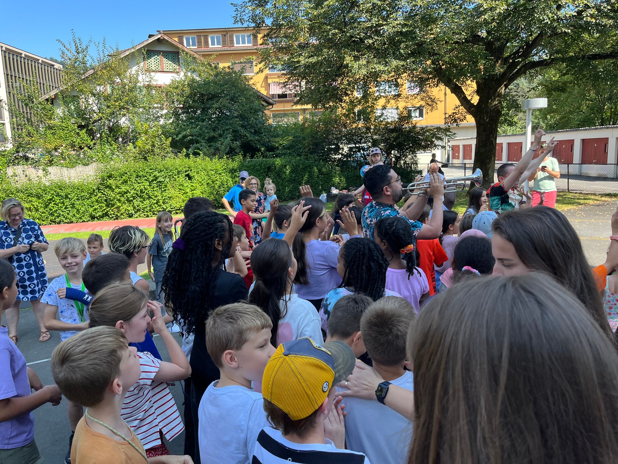Am 19.06. feierte das Schulhaus Zentrum den Tag der Musik. Dabei gab es Sing-, Tanz- und Bandpräsentationen aus allen Altersklassen. Nicht nur die Schüler und Schülerinnen konnten diverse musikalische Beiträge geniessen, sondern auch viele Eltern kamen vorbei. Auch Fussgänger*innen stoppten, um zu erkunden, woher diese spannenden, musikalischen Klänge herkamen. Nicht nur die Sonne strahlte an diesem Morgen, sondern auch die glücklichen Gesichter von ganz vielen Kindern.