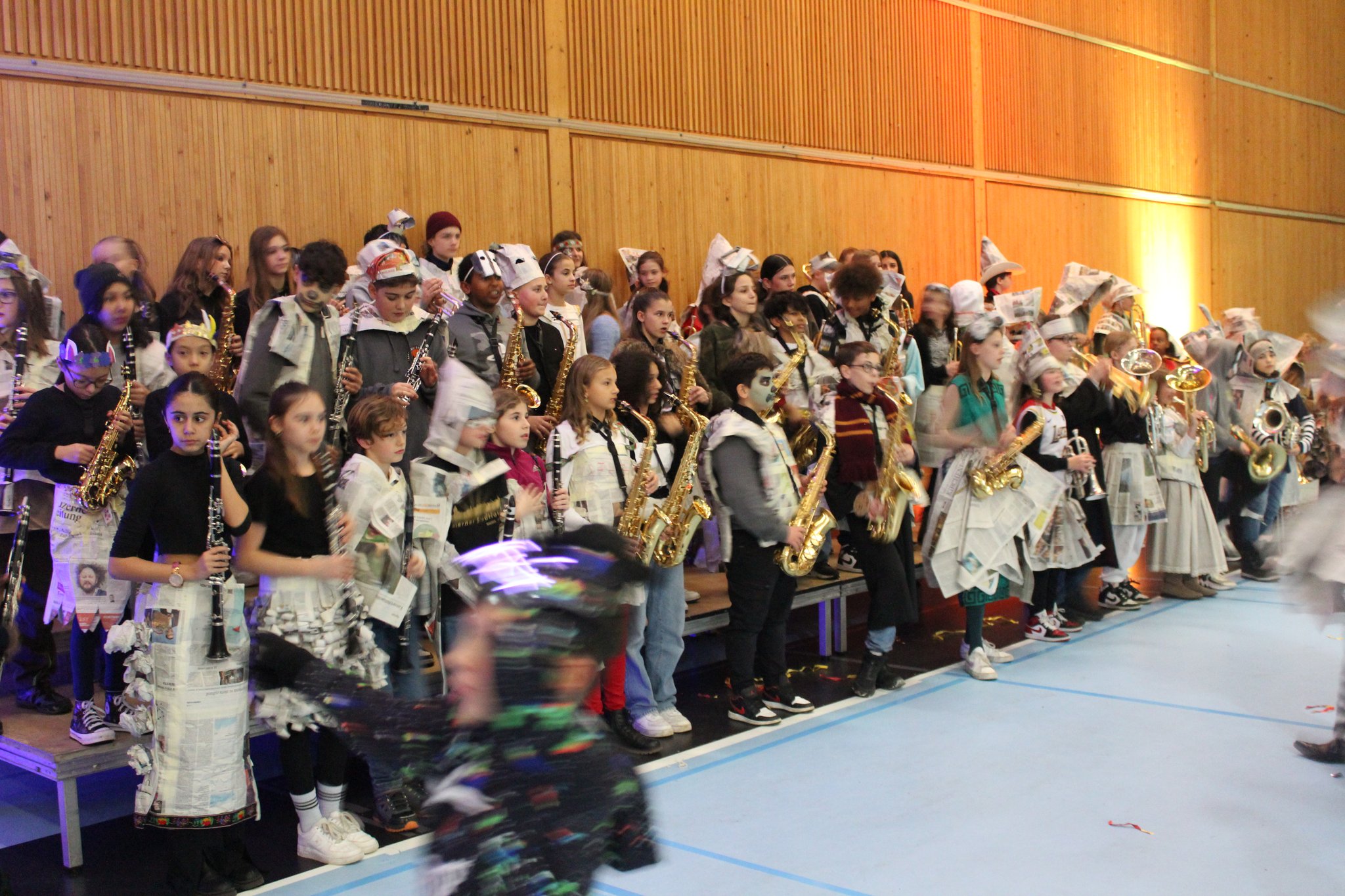Auch die Schule Zentrum liess sich am letzten Schultag vom Fasnachtsfieber anstecken und feierte in bunten Kostümen. Den Morgen verbrachten die Kinder der 1. und 2. Klasse damit, sich in verschiedenen spielerischen Aktivitäten auszutoben und ihr Können zu zeigen. Während im Grossfeld 3 mit viel Freude gespielt wurde, bereiteten sich die Schülerinnen und Schüler der 5. und 6. Klasse fleissig auf ihren Auftritt am Nachmittag vor. "We will rock you" war eines der Lieder, die sie mit viel Mut und Können in der Krauerhalle vor grossem Publikum präsentierten. Der Applaus nach ihrem Auftritt sprach für sich und mit einem stolzen Lächeln im Gesicht, beendeten die Kinder ihr Konzert.
