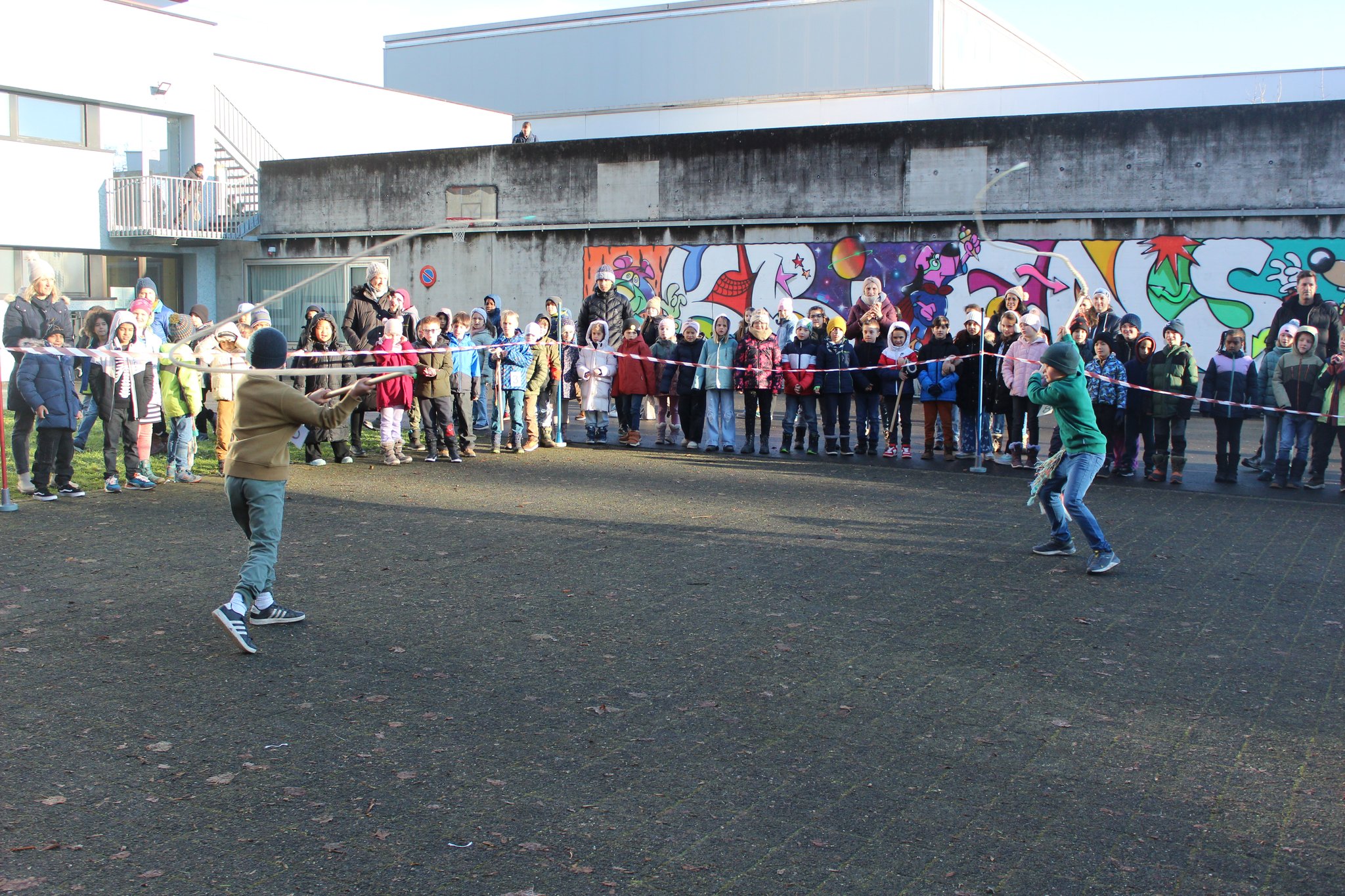 Die Stimmung war fröhlich und ausgelassen, als das Startsignal ertönte und die Kinder allesamt lossprangen. Insgesamt sprangen alle Kinder knapp 2'700 Runden an diesem Morgen. Einige schafften es sogar, die ganze Stunde stetig durchzuspringen.