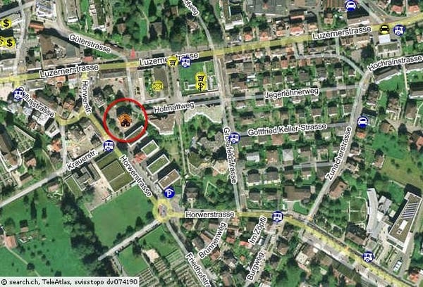Das Schulhaus Dorf liegt im Zentrum von Kriens, gerade hinter der Post und dem Einkaufszentrum Hofmatt. Es ist gut mit den öffentlichen Verkehrsmitteln erreichbar.
